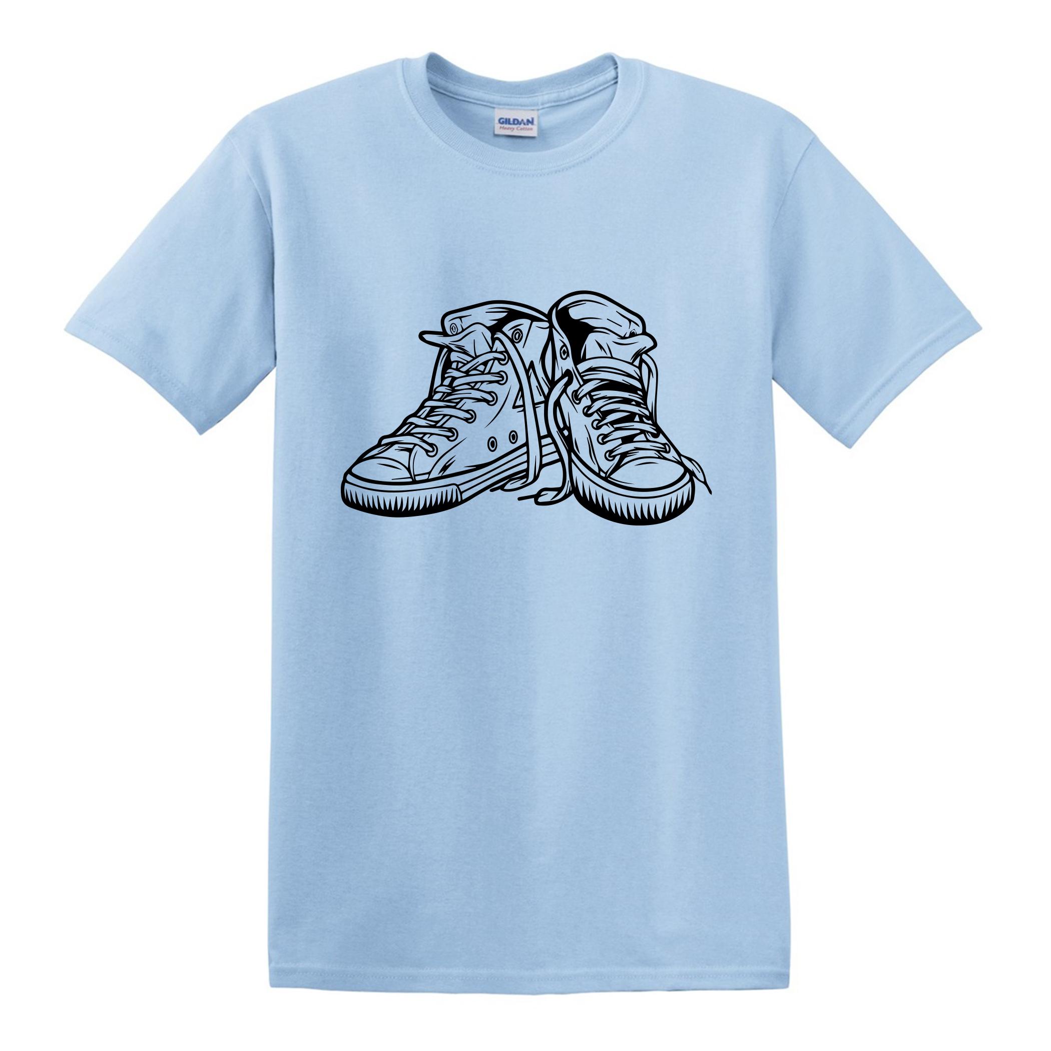At the heart of the design is a bold, minimal line-art illustration of classic sneakers, symbolizing movement, freedom, and modern street culture. The black sketch contrasts beautifully against the calm blue background, creating a striking visual that stands out without being loud. It’s the perfect balance between subtle and expressive—ideal for individuals who like their fashion to speak without shouting.